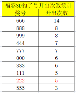 截至目前,福彩3D豹子号历史共已开出69次,其中“666”为最热号码,共开出过14次位列第一,而本次“222”的开出次数也达到了5次,与“111”并列第五,开出第2多的豹子号为“888”和“999”。