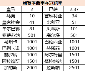 西甲开战在即,相关机构也给出了新赛季的西甲夺冠赔率,其中皇马1赔2暂居榜首,巴塞罗那1赔2.37屈居次席,而第3名马竞的赔率已达到1赔10,余下球队数据与TOP3差距过大,新赛季仍是双雄争霸局面,欧战排序与预期变化不大。