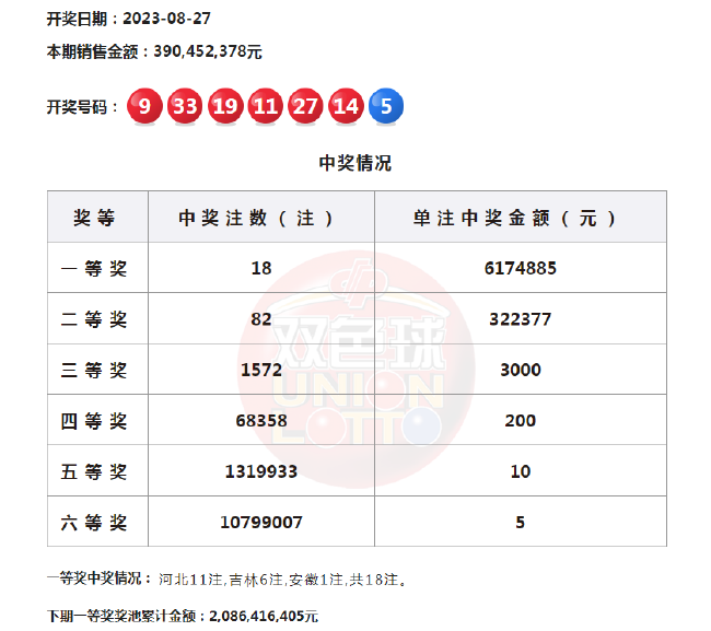 22:10 本期一等奖开出18注,单注奖金617万余元,18注头奖分落全国3地,其中河北独中11注,吉林6注,或爆3704万大奖,安徽1注。本期二等奖82注,单注奖金32万余元。本期双色球全国销售金额为3.9亿元,计奖结束后奖池余额20.8亿元。