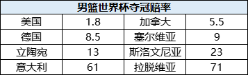 北京时间9月3日晚,男篮世界杯小组赛第二轮全部结束,8强球队出炉,前8名全部被欧美球队包揽,分别是美国、加拿大、德国、意大利、塞尔维亚、斯洛文尼亚、立陶宛以及拉脱维亚。相关机构即时更新了本届赛事的夺冠赔率,美国男篮1赔1.8遥遥领先,加拿大1赔5.5、德国1赔8.5分列二、三位。