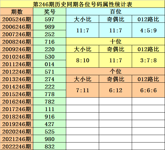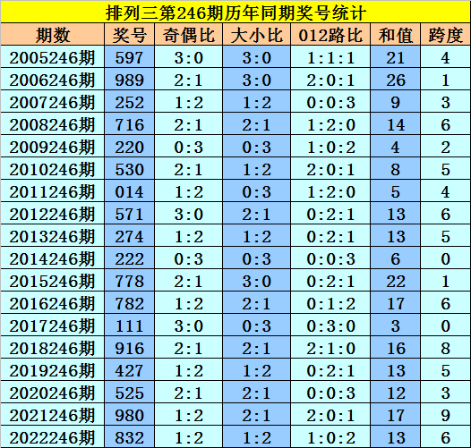 在第246期历史同期开奖中,号码0-9出现频次从高到低分别为:号码2→12次;号码7→8次;号码1→7次;号码5→6次;号码8、9→5次;号码0→4次;号码4→3次;号码3、6→2次。一般来说,表现最热的号码:1257中至少出现1个奖号。同时奖号不会全部出现在表现最冷的号码中。