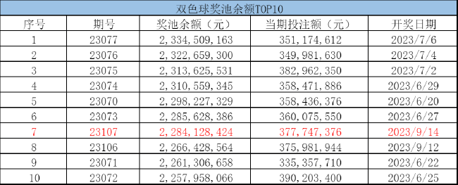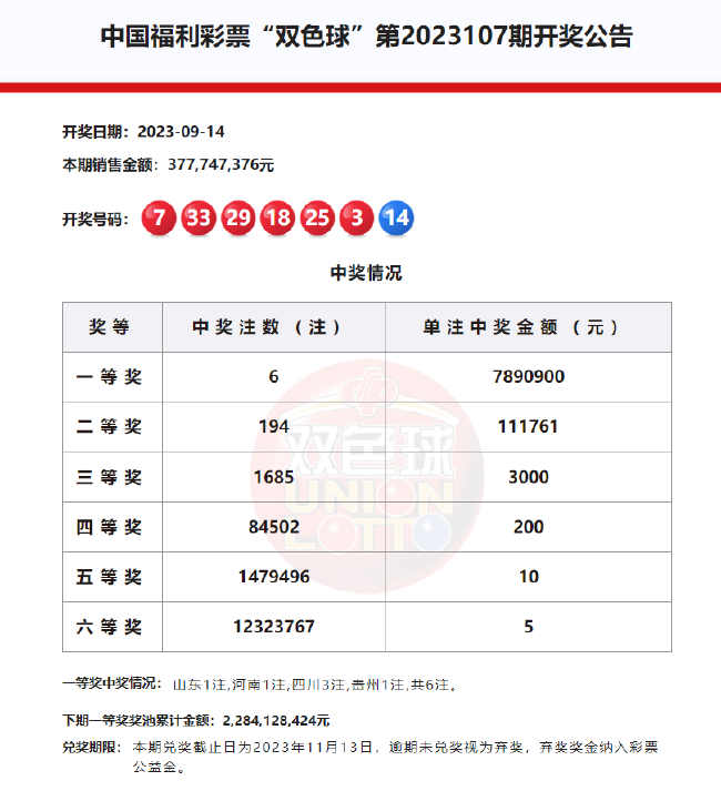 北京时间2023年9月14日,福彩双色球第23107期开奖,本期奖号为红球03 07 18 25 29 33,蓝球14。本期全国共开出6注一等奖,单注奖金789万余元,计奖结束后奖池余额22.84亿元,跻身双色球历史第7位!