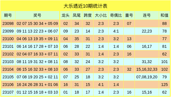 大乐透第23108期数据统计分析表