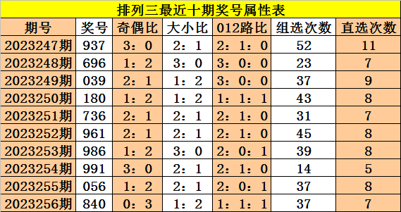 上期回顾:体彩排列三第2023256期奖号:840,奇偶比0:3,大小比1:2,012比1:1:1。