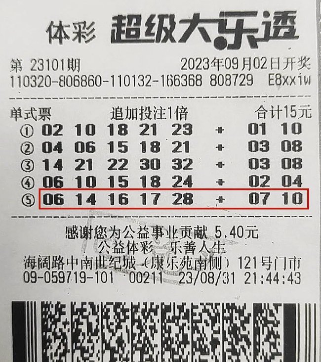 8月31日晚上九点多,小韩公司加班结束后就来到附近的一家体彩网点,按照习惯追加投注打了一组5注大乐透单式票。由于投注时间较晚,小韩实际购买的是9月2日开奖的大乐透第23101期,当期中奖号码为“06、14、16、17、28+07、10”,他的第5注号码一击命中,由于采用追加,他顶格中出1注追加投注一等奖,奖金高达1800万元。