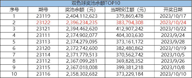 北京时间2023年10月24日,福彩双色球第23122期开奖,本期奖号为:红球07 08 14 18 20 30,蓝球05。本期全国共开出9注一等奖,单注奖金688万余元,计奖结束后奖池余额23.96亿元,超越上期奖池金额,排名双色球历史第2位!