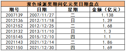 据统计,在双色球派奖期间诞生的亿元奖共有7个,2012年和2021年各开出2个,其余3个分别在2007年、2013年和2015年中出。一般来说,双色球游戏在周末的销售额会高于周中,销量越高,一定程度上代表爆出大奖的几率就越大。然而,在这7个派奖期间出现的亿元奖中,周日出现的仅有2次,最近3次均来自周中,周二最为“高产”,已3次拿下亿元大奖!