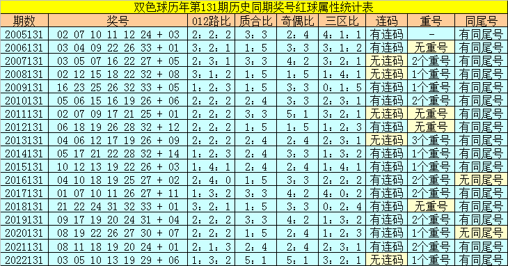 双色球第131期历史同期奖号与最近18期奖号频次统计分析: