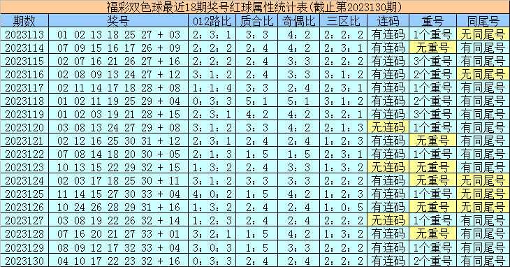 1、双色球第131期历史同期已开出了18期奖号,其中出现2次以内的冷码红球有:(11个):01、08、13、14、15、20、23、28、29、30、31;
