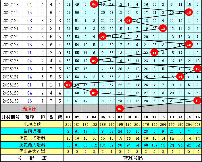 四、蓝球分析:在第131期历史同期开奖中,蓝球号码奇偶比为11:7,012路比为6:6:6,大小比为,4:14。