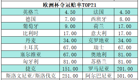 欧预赛小组赛收官战英法两强均在客场收获平局,赛后英格兰在欧洲杯夺冠赔率从此前1赔5.5降至4.5,从而追平法国的夺冠赔率,英法两强被视作明年欧洲杯的夺冠大热门。值得注意的是,英法两强的夺冠赔率,与身后的德国、西葡两强拉开一些差距。