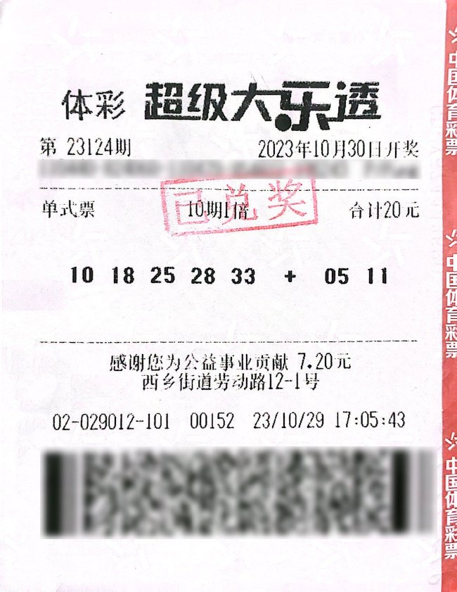 11月20日,体彩超级大乐透第23133期前区开出号码“10、18、25、28、33”,后区号码“05、11”。全国共开出6注一等奖,其中1注基本投注一等奖花落深圳,被4402029012实体店(店址:宝安区西乡街道劳动路12-1号)的购彩者摘得。中奖者萧先生10月29日在该店购买了一张“5+2”大乐透10期单式票,在第10期中得一等奖,中奖金额869万余元,贡献税收173万余元。