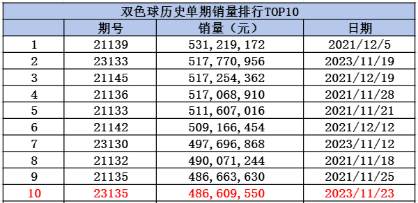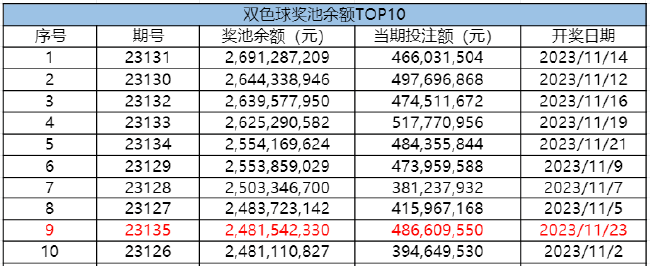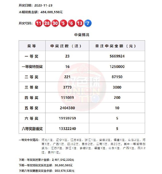 北京时间11月23日,福彩双色球第23135期开奖,同时本期还是双色球12亿大派奖的第7期开奖。本期一等奖开出23注566万余元却无亿元奖,其中16注获得一等奖特别奖加奖125万元,单注奖金达到691万余元;一等奖特别奖江苏收获7注,安徽和四川各2注,浙江、福建、山东、广西和贵州各1注,7注基本头奖落于河北、辽宁、江苏、山东、河南、广西和贵州。二等奖开出221注8.7万余元。本期双色球投注额为486,609,550元,跻身双色球历史单期销量第10位!计奖结束后,双色球奖池降至24.81亿,排名双色球奖池历史第9位!