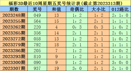 福彩3D第2023307期(上周星期五)奖号为937。其中奖号奇偶比为3:0,大小比为2:1,012路比为2:1:0。