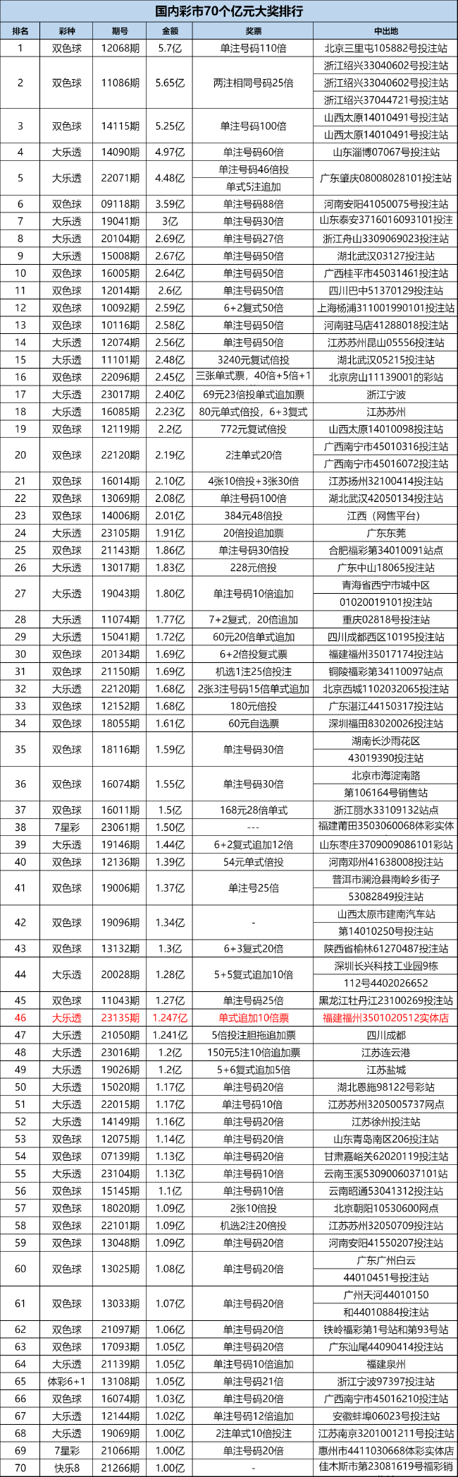 这是今年国内彩市开出的第6个亿元奖,距离上一个1.91亿元的巨奖相隔75天,这也是体彩大乐透历史第28次开出亿元大奖。同时,这是国内彩市开出的第70个亿元奖,本次大乐透1.24亿排名第46位。