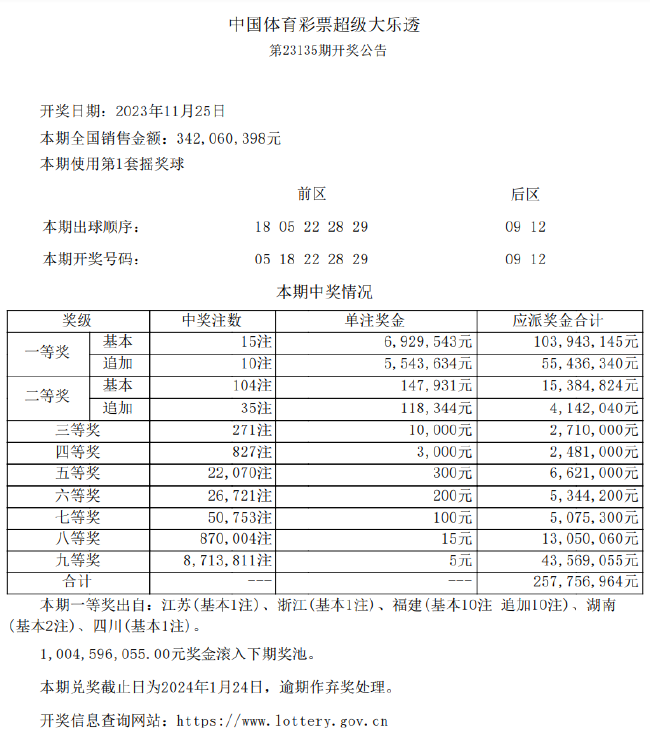北京时间11月25日晚,体彩大乐透第23135期开奖,当期奖号为前区05 18 22 28 29,后区09 12。本期头奖开出15注,单注奖金692万余元,其中10注选择追加,多得奖金554万余元,单注追加头奖达到1247万余元。经新浪彩票确认,本期10注追加头奖均出自福建省福州市3501020512实体店,中奖彩票为一张经10倍投的单式追加票,单票擒奖1.24亿元!