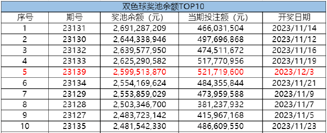 此外,本期一等奖特别奖加奖共2000万元全部派完,按照派奖规则,下期(第23140期)一等奖特别奖派奖金额为2000万元,六等奖翻番奖奖金余额303,916,100元。