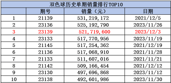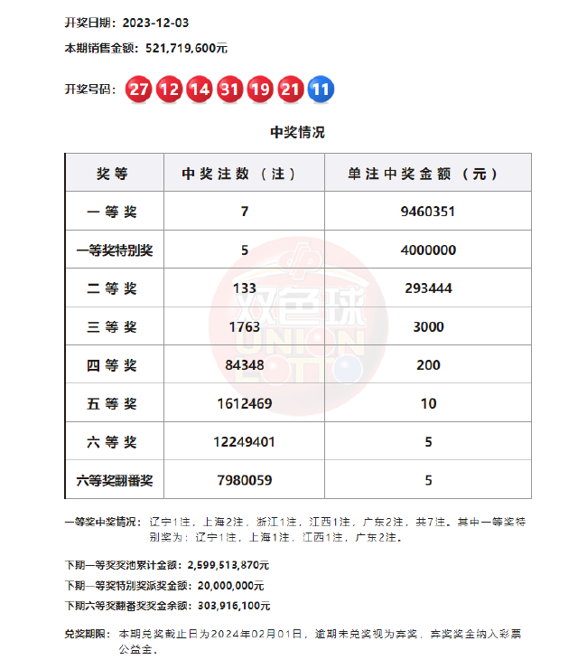 北京时间12月3日,福彩双色球第23139期开奖,同时本期还是双色球12亿大派奖的第11期开奖。本期一等奖开出7注946万余元,其中5注获得一等奖特别奖加奖400万元,单注奖金达到1346万余元;一等奖特别奖广东揽获2注,辽宁、上海和江西各1注,2注基本头奖分别落于上海和浙江。二等奖开出133注29.3万余元。本期双色球投注额为521,719,600元,排名双色球历史单期销量第3位;奖池余额2,599,513,870元,历史第5。