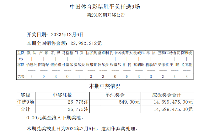 北京时间12月6日,胜负彩第23159期任九开奖结果揭晓。任九开出26775注,单注奖金549元。本期任九投注总额为22,992,212元。