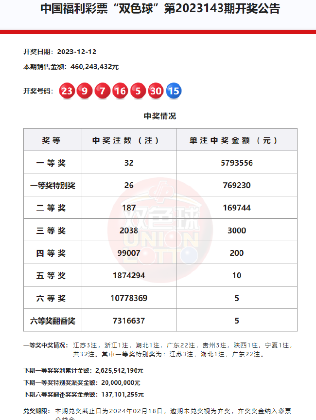 北京时间12月12日,福彩双色球第23143期开奖,同时本期还是双色球12亿大派奖的第15期开奖。本期一等奖井喷32注579万余元,其中26注获得一等奖特别奖加奖76万余元,单注奖金656万余元。本期双色球投注额为460,243,432元,奖池余额为2,625,542,196元,排名历史第6。经检索,广东的22注一等奖均落户广州,且由一张彩票独中。中奖彩票是一张22倍投注的2注单式自选票,投注金额88元,由南沙区珠江管理区英贤路4号的44010841销售网点售出,总奖金达到1.44亿多元。