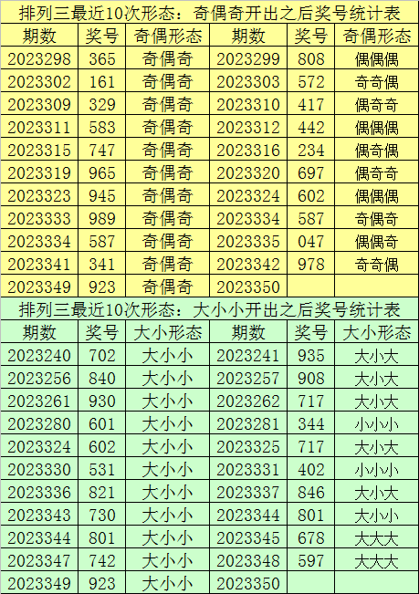 排列三最近10次同时开出奇偶形态:奇偶奇和大小形态:大小小时其奖号分别为:703-921-901-901-503-521-743-721-723-901-923,下期分别开出号码为:358-946-466-649-209-583-167-082-514-773,详细统计见下表: