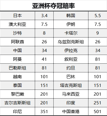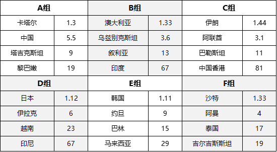 其它球队中,刚刚在热身赛中击败国足的阿曼1赔41,叙利亚、巴勒斯坦和约旦均为1赔81,余下所有球队均超过1赔100。
