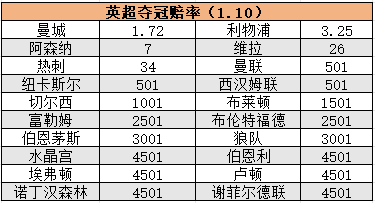 其他球队中,维拉1赔26、热刺1赔34、曼联1赔501、纽卡斯尔1赔501、西汉姆联1赔501,其余各队均已超过1赔1000。(萧何)