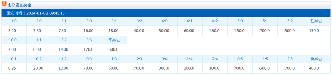 竞彩官方开出了比分赔率,国足赢球1-0赔率最低为1赔5.2,其次是2-0与2-1均为1赔7.5;塔吉克斯坦方面,1-0最低为1赔8.25;双方平局的最低赔为1-1的1赔6。