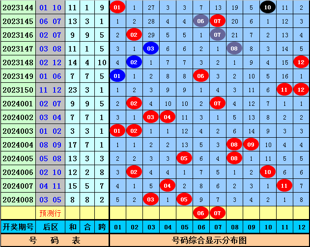 前区重号分析:最近10期4次开出重号,重号走势较冷,本期防重号回补,关注重号06。