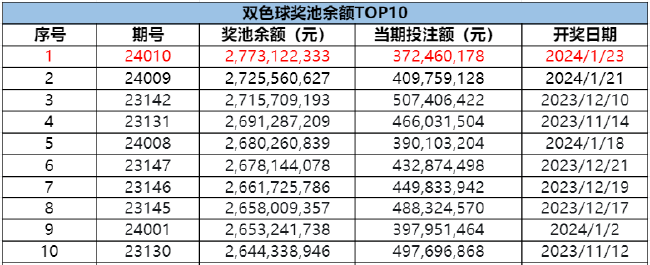 北京时间2024年1月23日,福彩双色球第24010期开奖,本期奖号为红球11 16 20 21 23 24,蓝球04。值得一提的是,本期一等奖开出4注1000万,计奖结束后奖池余额升至2,773,122,333元,刷新双色球历史奖池纪录,暂时排名榜首!