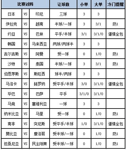 本期让步较多的比赛场次有3场。日本上场在小组赛第二场比赛中1-2不敌伊拉克,前2场小组赛取得1胜1负的成绩,状态不佳,此役面对的印尼上场在小组赛第二场比赛中1-0小胜越南,前2场取得1胜1负的成绩,本场机构给出在三球的让步幅度,对于日本有利,此役可以关注单3。