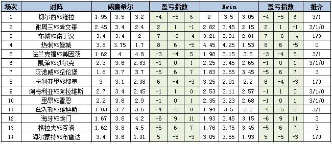 本期通过盈亏指数还有几场比赛值得关注:谢周三VS考文垂的比赛机构给出较少的让步,盈亏指数给出在正正负的组合,但是正负值差距不大,此役建议全包,任九重点舍弃;里昂VS雷恩的比赛盈亏指数给出负正正的组合,但是正负值同样差距不大,此役建议全包,任九重点舍弃;格拉夫VS芬洛的比赛机构给出半球的让步,盈亏指数给出负正正的组合,对于主队有倾斜,本场可以博单3。