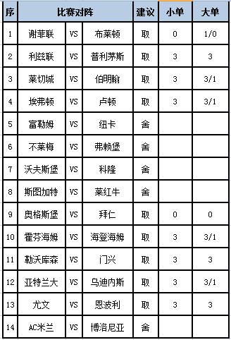 本期任九在5场足总杯+6场德甲+3场意甲的基础上舍弃了几场让步较浅的比赛:富勒姆上场在主场1-1战平利物浦,最近2场各项赛事未尝一胜,状态不足,此役主场面对上场2-3不敌曼城,最近5场比赛输足4场,状态走低的纽卡,机构给出在受平半的让步居多,对于纽卡的阵容实力还是没有十足的倾斜,此役舍弃;