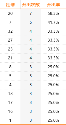 2024年至今,福彩双色球游戏已进行过12次开奖,而上表展示了所有至少开出3次的红球奖号。可以看出,偶数20开出7次位居榜首,12期开奖开出7次,开出率接近6成;奇数07开出5次紧随其后,开出率超4成;之后的32、27、23、21均开出4次。