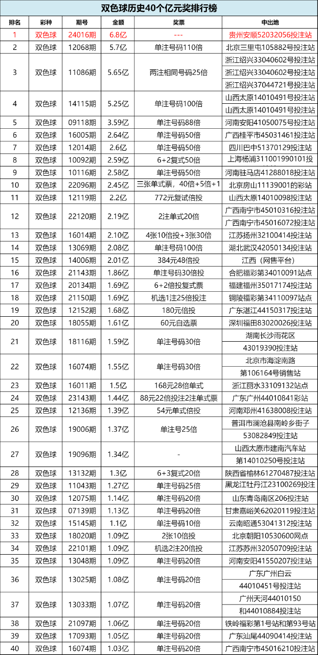这是双色球在2024年开出的第1个亿元奖,距离2023年12月12日晚广东广州双色球1.44亿巨奖相隔56天。同时,这也是双色球历史上第40个亿元奖,此次贵州安顺市中出的6.8亿巨奖,排名双色球亿元奖历史第1位。