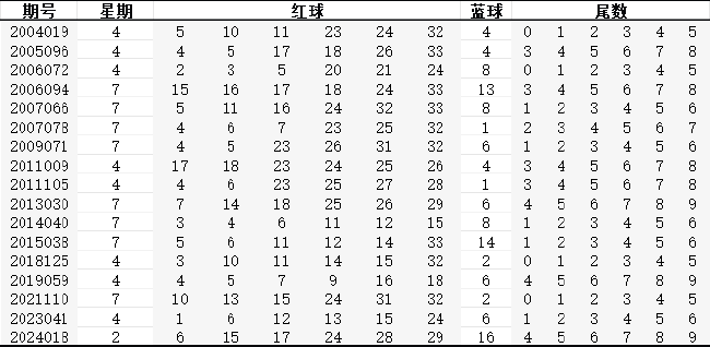 蓝球方面,上期开出偶数16,而通过对比此前16次该形态下的蓝球可以看出,偶数蓝球占据绝对优势,共计14次开出,而奇数红球仅3次。还有一点需要注意,双色球游戏每周二、四、日开奖,17次红球尾数6码顺子组合,周四和周日均开出8次,而上期则是首次在周二现身,神奇"规律"被打破,蹲守尾数的彩民朋友们可参考以上特点。