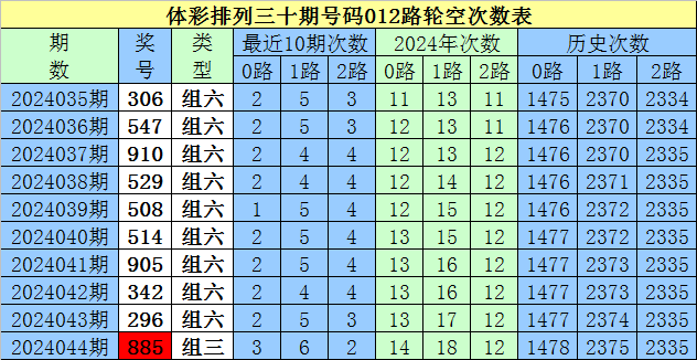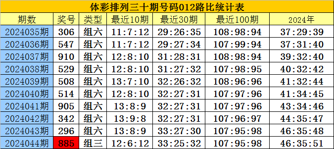 开奖回顾:排列三第2024044期奖号为:885,号码012路比为0:0:3。