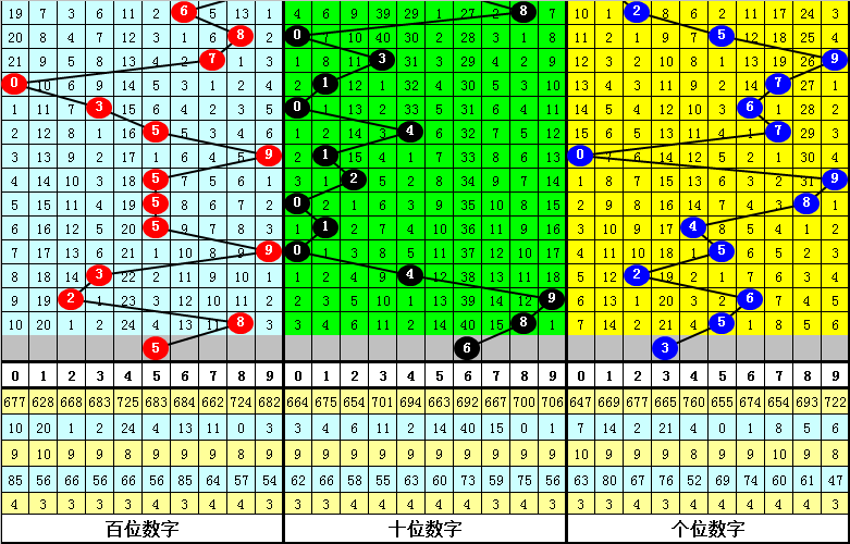 0路号码上期没有出现,近10期开出12个表现相对活跃,其中0开出4个、3开出2个、6开出2个、9开出4个,本期应注意0路号码回补,参考号码3、6。