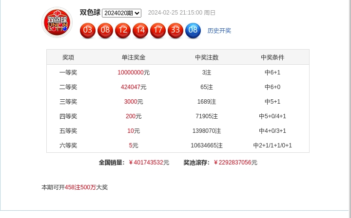 双色球第2024020期奖号开出:03 08 12 14 17 33 + 08,红球号码和值87,跨度30,重号12、17。蓝球为2路号码。