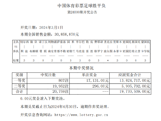 北京时间3月1日,胜负彩第24030期开奖结果揭晓。本期一等奖井喷807注,单注奖金17,131元,二等奖开出19,952注,单注奖金296元;任九开出106,783注123元。本期胜负彩销量为30,858,870元,任九投注总额为20,586,232元