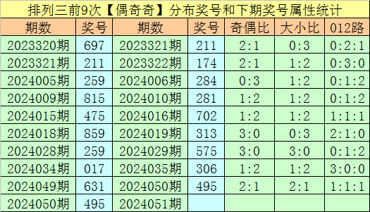 上期回顾:排列三第2024050期开出奖号495,类型为:偶奇奇、102路和小大大。