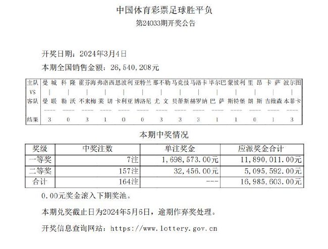 北京时间3月4日,胜负彩第24033期开奖结果揭晓。本期足彩头奖开出7注,单注奖金1,698,573元,二等奖开出157注32,456元,任九开出1,199注13,248元。本期14场销量为26,540,208元,任九投注总额24,820,830元。