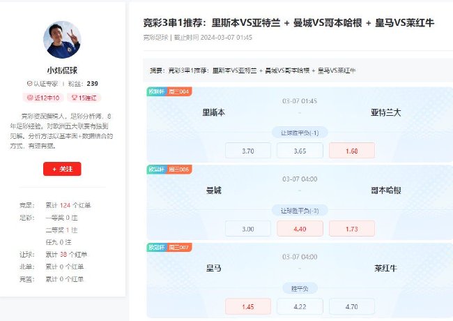 这场比赛的首回合曼城做客3比1取胜,这样的话本场比赛实际上曼城并不会全力以赴。由于首回合的优势,曼城本场可以接受平局、一球小负的结果都能晋级。所以他们没有理由在本场比赛耗费太多体能,像德布劳内和哈兰德我觉得可能未必会踢。因为我们需要注意到,目前曼城在联赛落后利物浦1分,3天后曼城将做客联赛面对利物浦,那场比赛可以说是对冠军走势产生非常大影响的比赛,所以我相信瓜迪奥拉的心思都在那场比赛中。本场比赛数据方面曼城主场以2.25球开出,但要考虑到曼城的战意问题,所以本场竞彩主让3球,看好让球负。