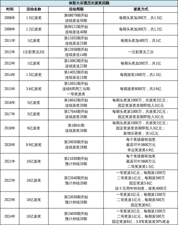 大乐透玩法自2007年上市至今已走过17个年头,而第一次派奖活动在2008年开启,距今已有16年之久。在这17年间,大乐透一共开展过15次(含本次)派奖活动,详情如下: