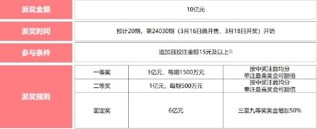 根据派奖规则,一等奖派奖金额3亿元,每期派送1500万元;二等奖派奖金额1亿元,每期派送500万元。派奖期间,符合参与条件且中得一等奖或二等奖的彩票,将按注均分当期派奖奖金,单注奖金最高可翻倍。