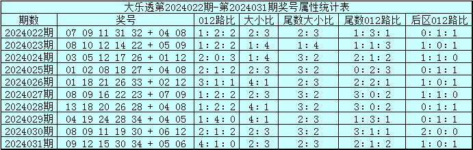 体彩大乐透第24031期奖号为:09 12 15 30 34+05 06,其中前区奖号012路比为4:1:0,大小比为2:3,奇偶比为2:3,没有同尾奖号。