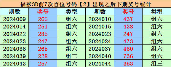 在百位号码2前7次开出之后,其下期分别开出号码:4、4、2、4、4、7、3,其中号码大小比为1:6,012路比为1:5:1,奇偶比为2:5。