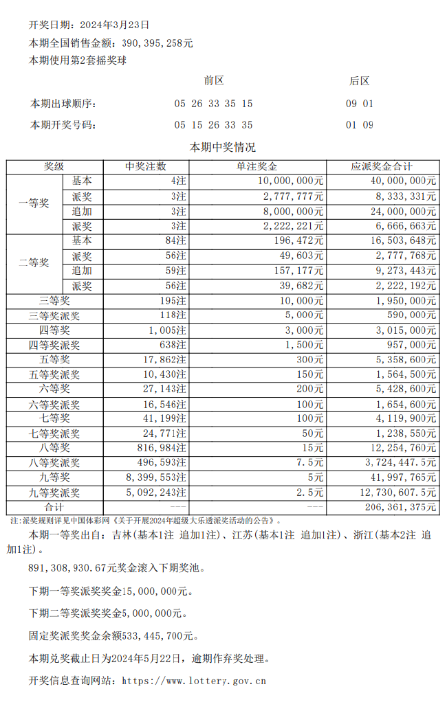 本期二等奖开出84注,基本投注单注奖金为19.64万余元,其中59注采用追加投注,单注追加奖金15.71万余元。本期共有56注二等奖符合本次派奖参与条件,每注还可多得二等奖派奖奖金8.92万余元,分享派奖奖金后,二等奖单注总奖金为44.29万余元。奖池方面,本期开奖结束后,8.91亿元滚存至3月25日(周一)开奖的第24033期。