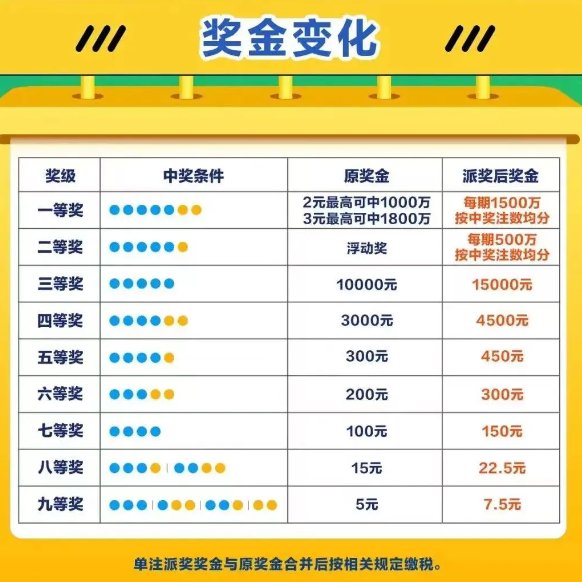 在派奖过程中,符合派奖参与条件的彩票将享有派奖奖金,而大乐透9个奖级均有派奖,派奖后的金额如下: