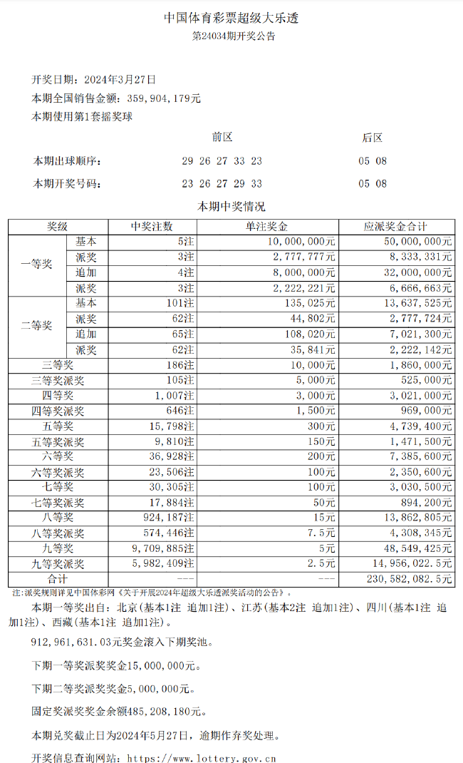 二等奖开出101注,每注基本奖金为13.5万余元;其中65注采用追加投注,多揽10.8万元,单注奖金24.3万余元。本期共有62注二等奖符合本次派奖参与条件,单注奖金为(基本奖金13.5万+追加奖金10.8万+基本奖金派奖4.4万+追加奖金派奖3.5万)32.3万余元。奖池方面,本期开奖结束后,9.12亿元滚存至3月30日(周六)开奖的第24035期。